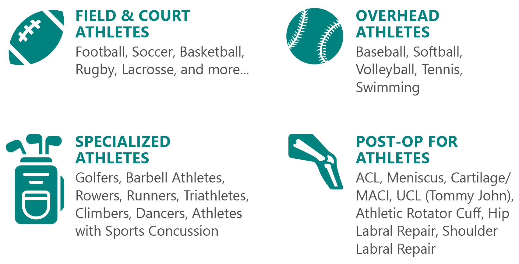 The IRG Sports Institute offers athletic rehabilitation and development all under one roof. Our Physical Therapists, Athletic Trainers, and Strength and Conditioning Coaches have personal experience in the management of athletic injuries and performance training which will allows them to develop and implement the most effective plan for a safe and complete return to your sport or activity.